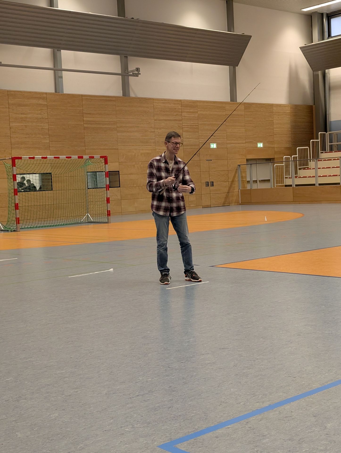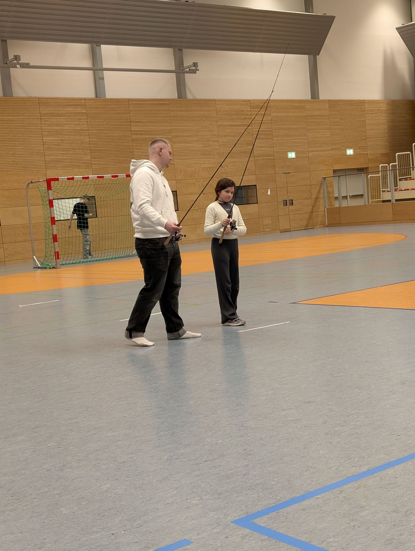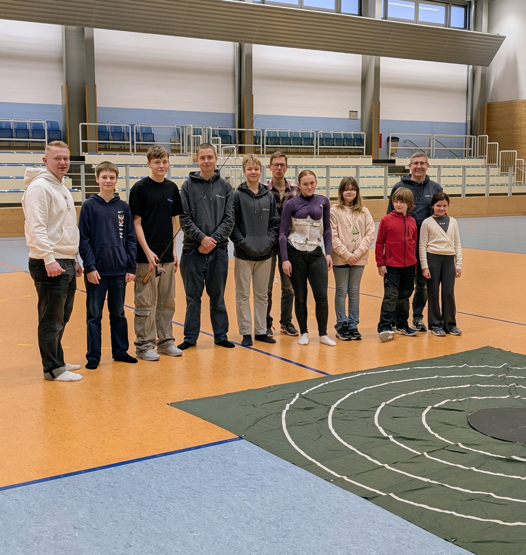 Am 13.04.2025 um 09 Uhr trafen sich wieder einige Angelbegeisterte in der Sporthalle am Anton-Saefkow-Platz. Wir wollten unser Geschick beim Casting – sprich zielgenaues Werfen mit einer Angelrute üben. Neben den bekannten Betreuern Karsten Lewe, Peter Zimmermann und Christian Wehle probierten sich 6 Kinder und 2 Väter aus. Das Ziel, eine Holzscheibe auf einem auf dem Boden liegenden Tuch (siehe Foto), sollte getroffen werden. Es wurde aus 2 Distanzen - 10m und 15m – auf das Ziel geworfen. Als erfahrenen Castingsportler hatten wir uns Gregor, den Sohn von Peter Zimmermann, eingeladen. Er gab uns allen beim „Warmwerfen“ Hinweise, damit das kleine Gewicht an der Rute das Ziel trifft. Nach dem „Warmwerfen“ konnten erst die Kinder und dann die Erwachsenen die Hinweise umsetzen. Jeder hatte Spaß und freute sich, wenn das kleine Wurfgewicht auf der Holzplatte hörbar aufschlug. Natürlich ging auch mal ein Wurf „übers Ziel hinaus“. Auch hier gilt: „Übung macht den Meister!“ 😉 Für genügend Kaffee oder Wasser oder Schorle hatten wir gesorgt und auch einige Ostersüßigkeiten lagen zum Naschen parat.