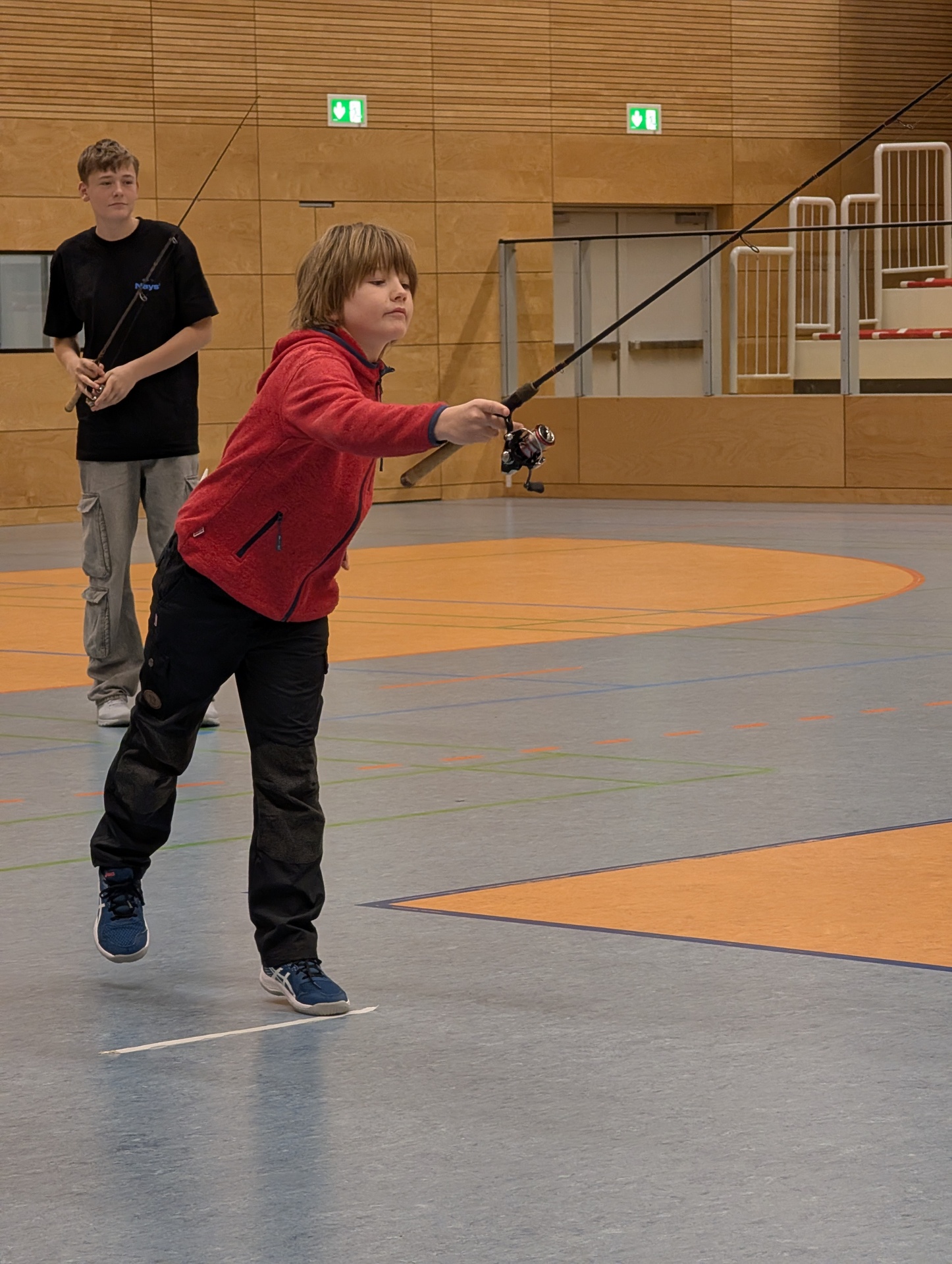 Am 13.04.2025 um 09 Uhr trafen sich wieder einige Angelbegeisterte in der Sporthalle am Anton-Saefkow-Platz. Wir wollten unser Geschick beim Casting – sprich zielgenaues Werfen mit einer Angelrute üben. Neben den bekannten Betreuern Karsten Lewe, Peter Zimmermann und Christian Wehle probierten sich 6 Kinder und 2 Väter aus. Das Ziel, eine Holzscheibe auf einem auf dem Boden liegenden Tuch (siehe Foto), sollte getroffen werden. Es wurde aus 2 Distanzen - 10m und 15m – auf das Ziel geworfen. Als erfahrenen Castingsportler hatten wir uns Gregor, den Sohn von Peter Zimmermann, eingeladen. Er gab uns allen beim „Warmwerfen“ Hinweise, damit das kleine Gewicht an der Rute das Ziel trifft. Nach dem „Warmwerfen“ konnten erst die Kinder und dann die Erwachsenen die Hinweise umsetzen. Jeder hatte Spaß und freute sich, wenn das kleine Wurfgewicht auf der Holzplatte hörbar aufschlug. Natürlich ging auch mal ein Wurf „übers Ziel hinaus“. Auch hier gilt: „Übung macht den Meister!“ 😉 Für genügend Kaffee oder Wasser oder Schorle hatten wir gesorgt und auch einige Ostersüßigkeiten lagen zum Naschen parat.